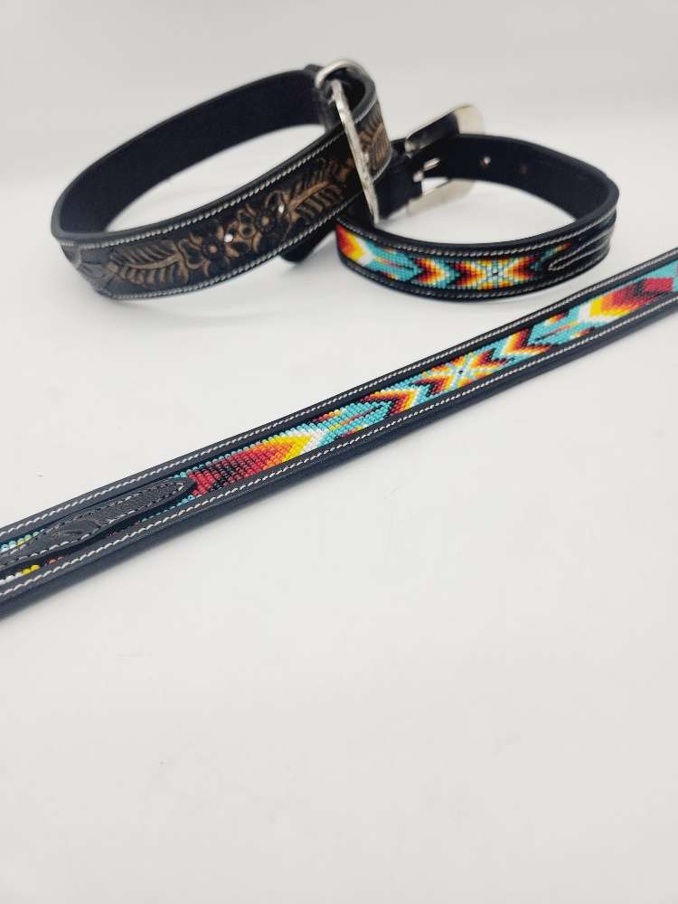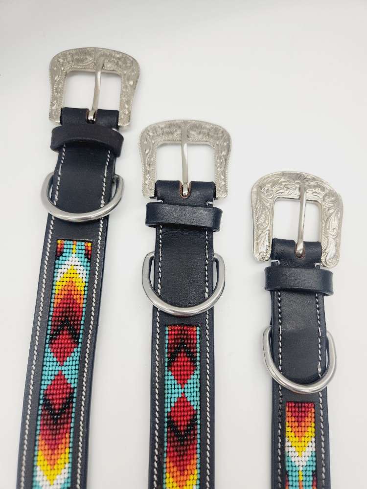 The Navajo Spring Leather Dog Collar is a handcrafted, stylish dog collar featuring intricate beadwork inlaid on soft, hand-carved and painted leather. Designed for both elegance and durability, this weather-resistant collar is perfect for outdoor adventures in any season. Offering a balance of strength and softness, it provides a luxurious feel while being adjustable to fit various dog breeds.