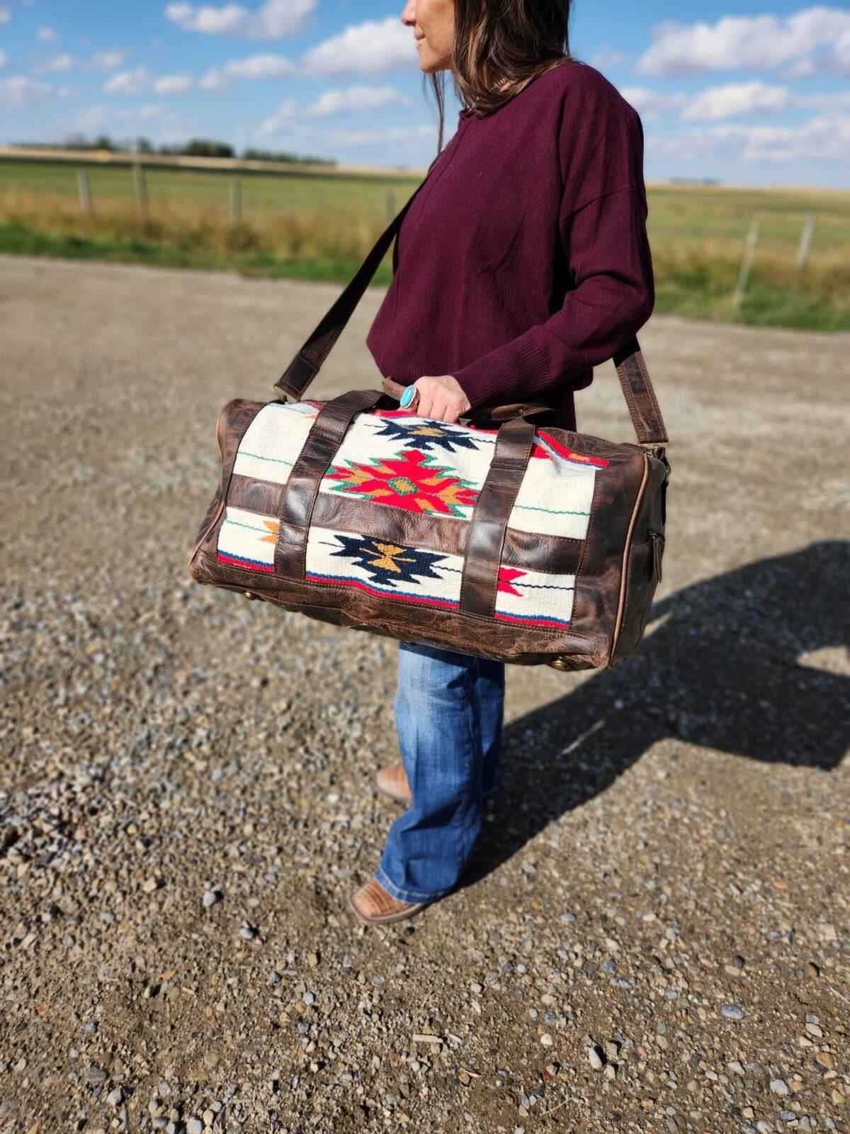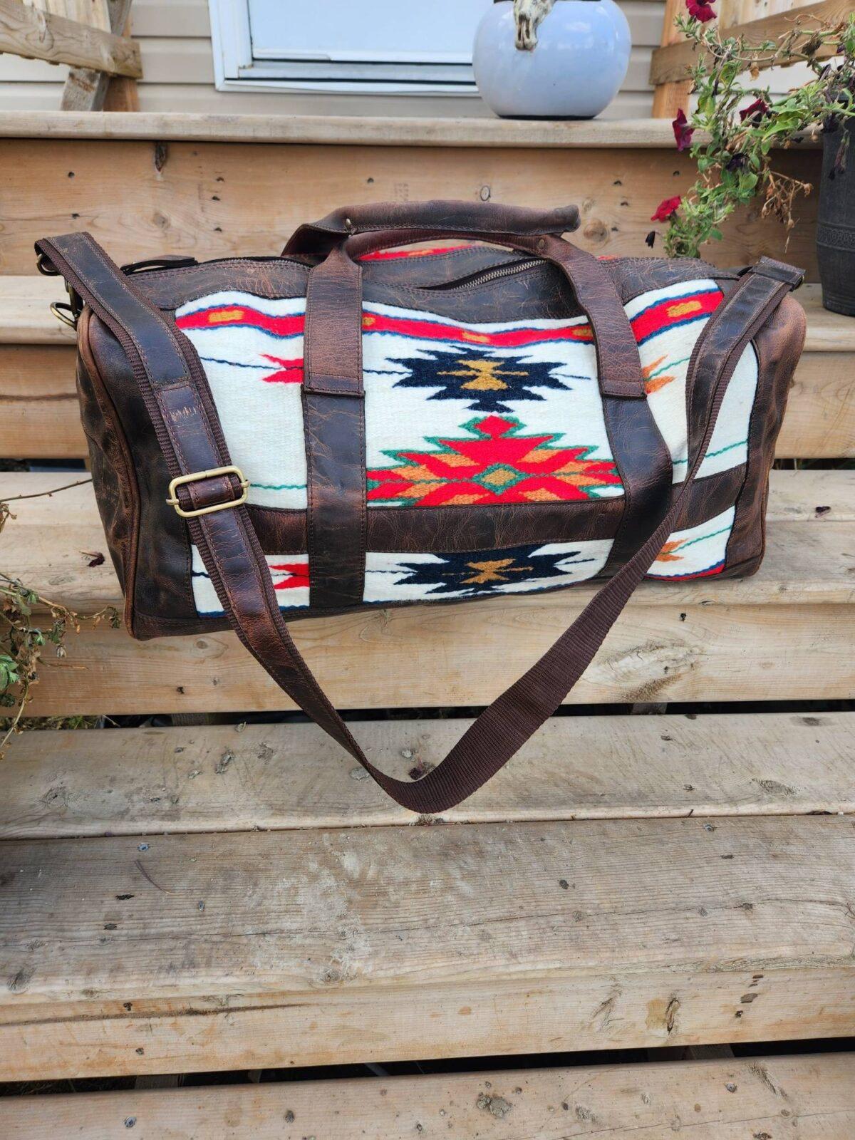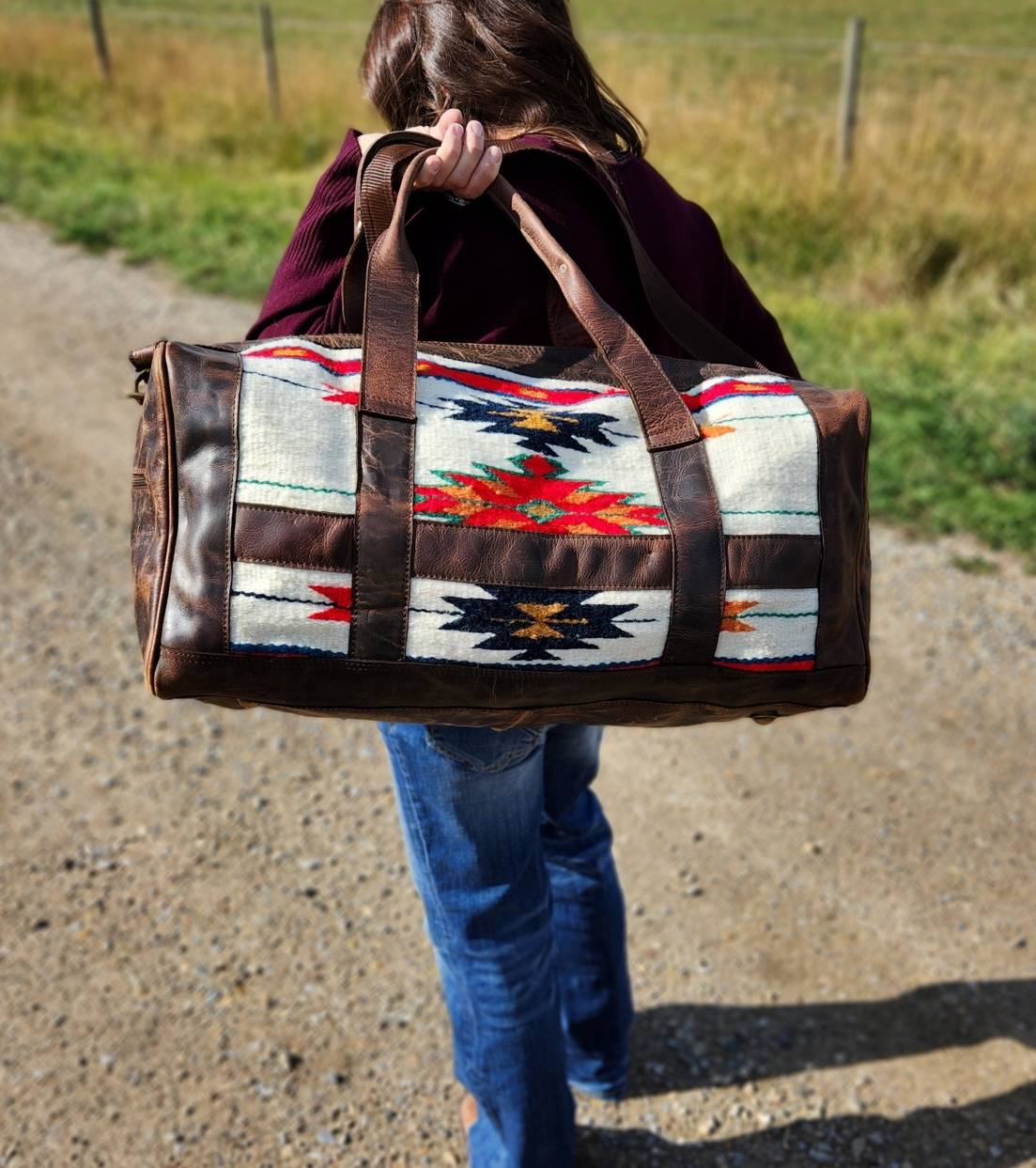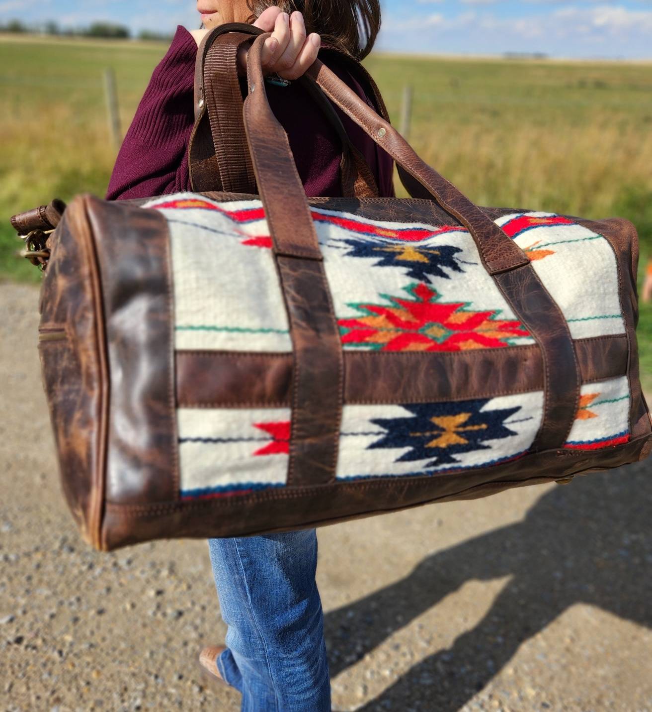 The Alpine saddle blanket duffel bag is the ultimate weekend getaway accessory! With the perfect of red, green and blue pattern on an off-white background this duffel bag is ready for your trip to the mountains, to the city or where ever the adventure lays ahead! Gorgeous neutral hand woven saddle blanket pattern and distressed leather. These duffel bags are made with our two favorite materials leather + saddle blanket. Featuring unique western chic designs, these duffel bags are for all the saddle blanket addicts out there.