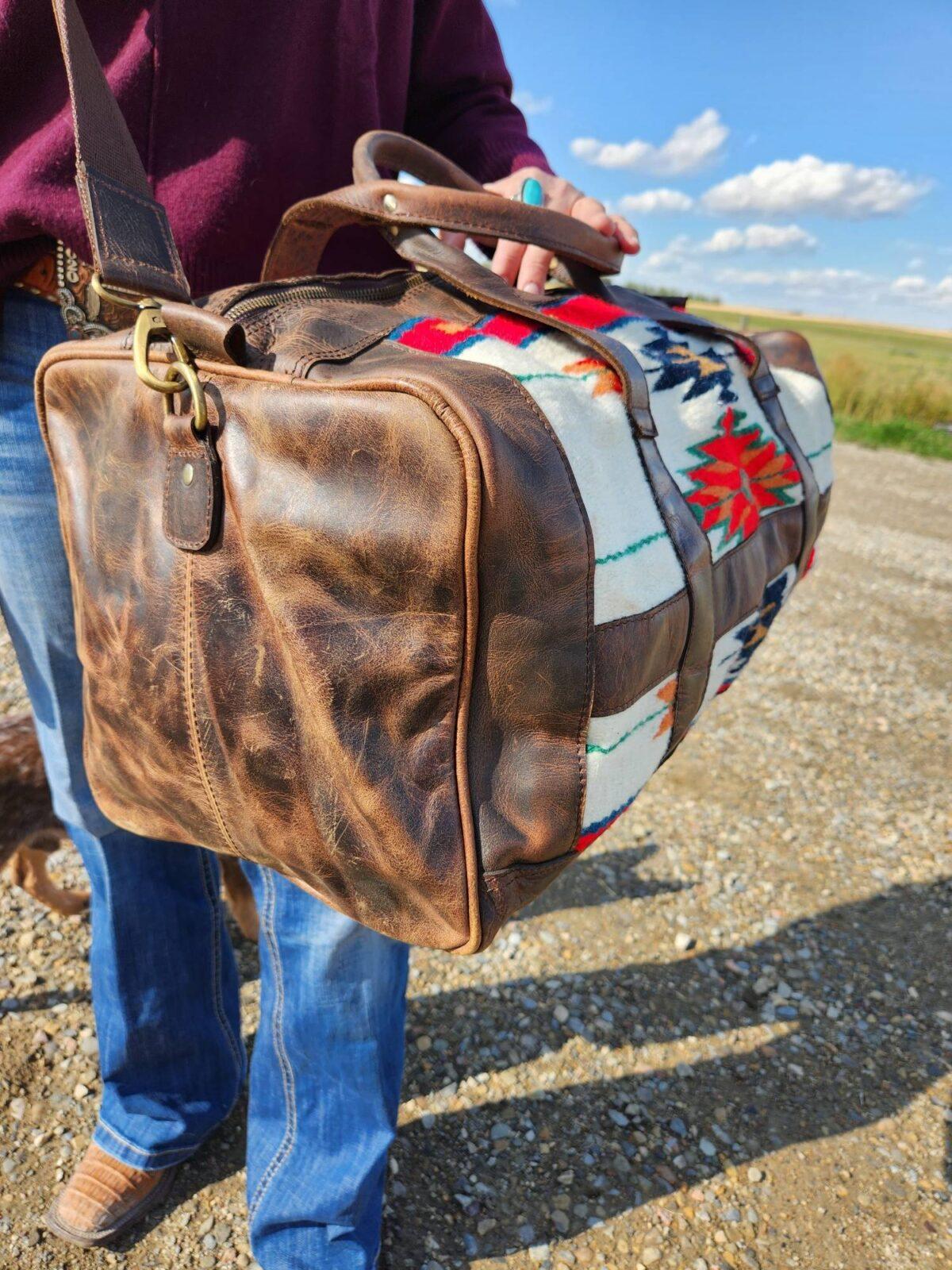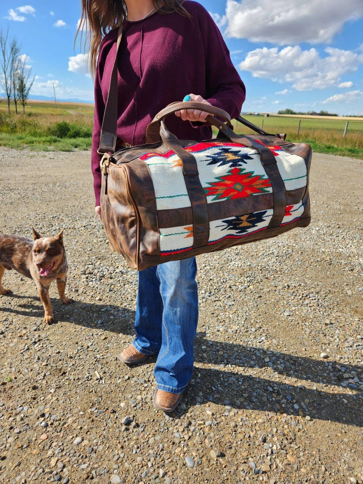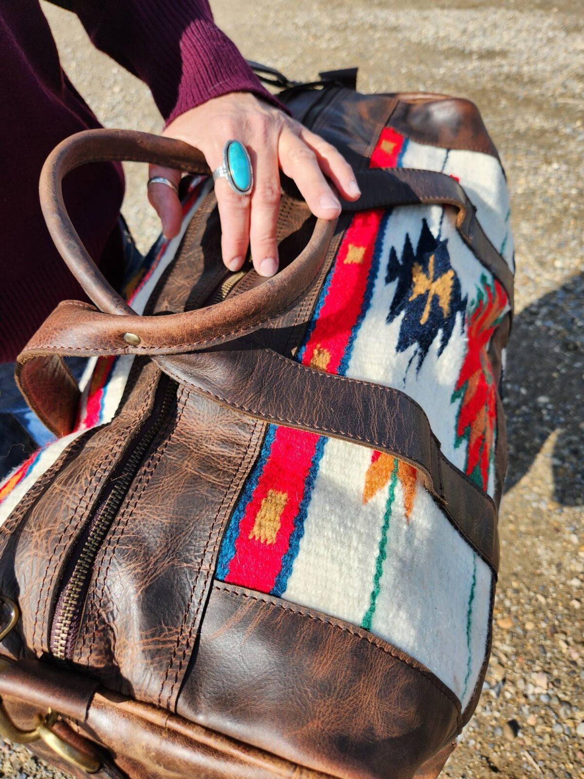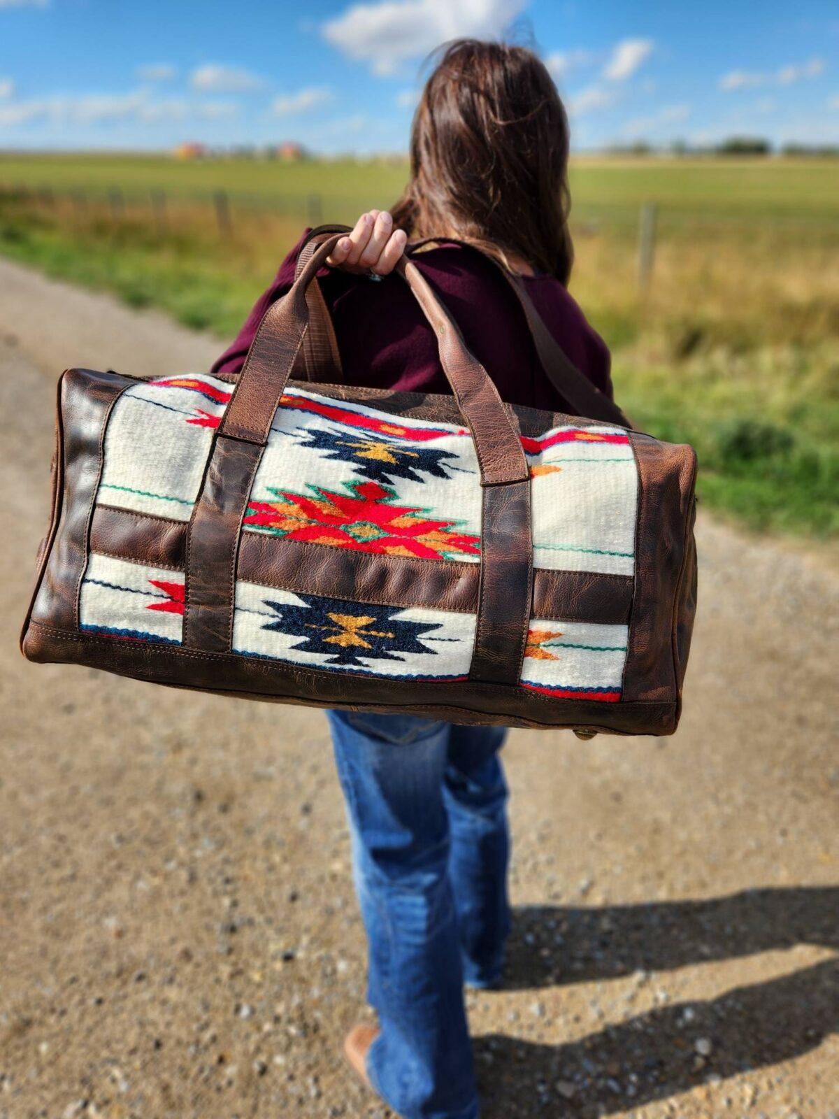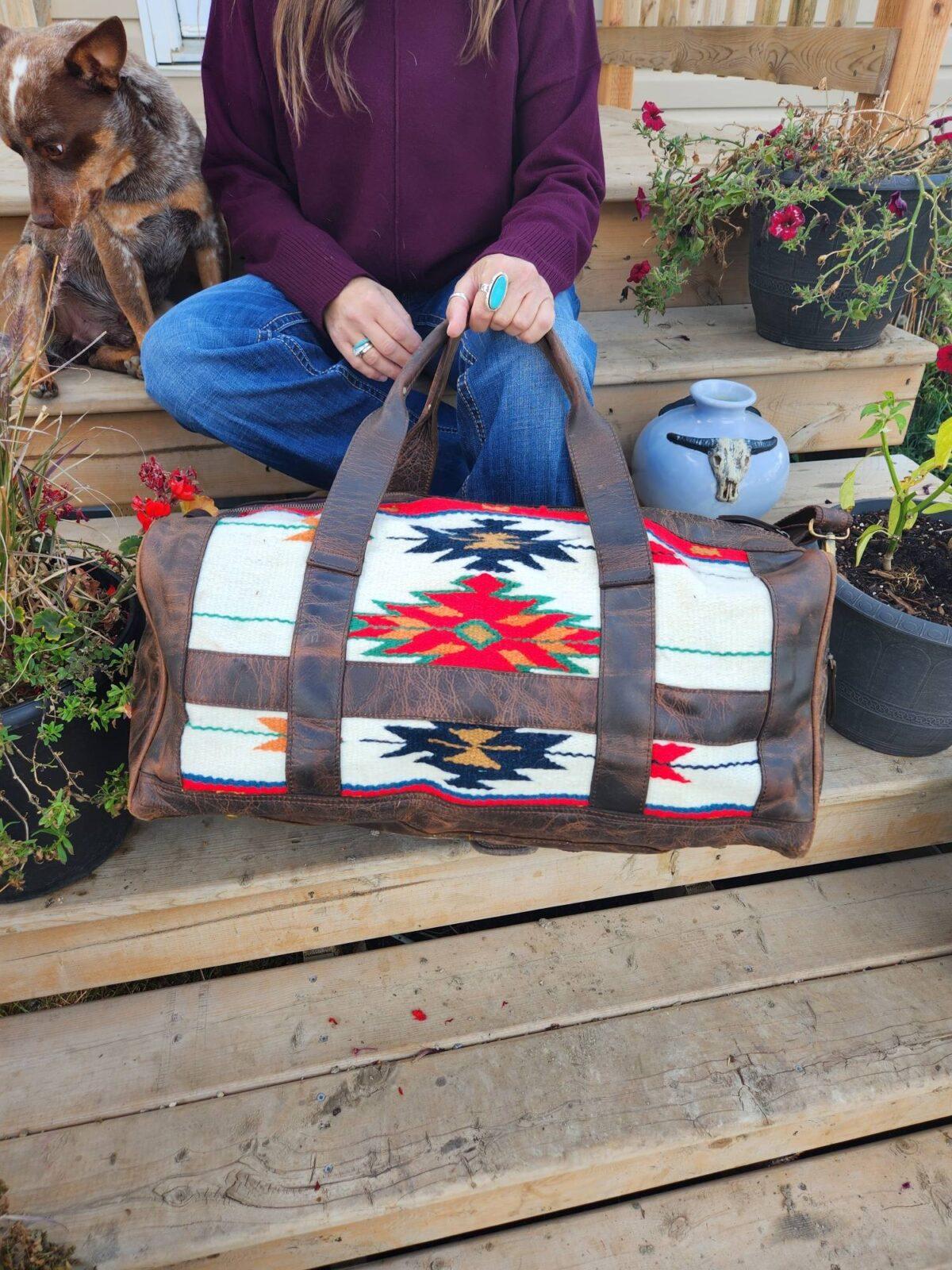 The Alpine saddle blanket duffel bag is the ultimate weekend getaway accessory! With the perfect of red, green and blue pattern on an off-white background this duffel bag is ready for your trip to the mountains, to the city or where ever the adventure lays ahead! Gorgeous neutral hand woven saddle blanket pattern and distressed leather. These duffel bags are made with our two favorite materials leather + saddle blanket. Featuring unique western chic designs, these duffel bags are for all the saddle blanket addicts out there.
