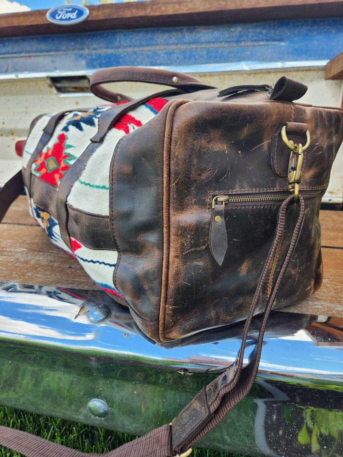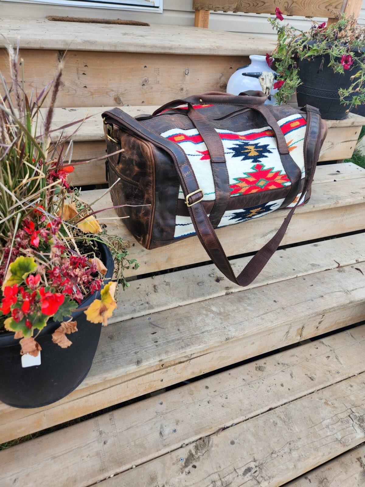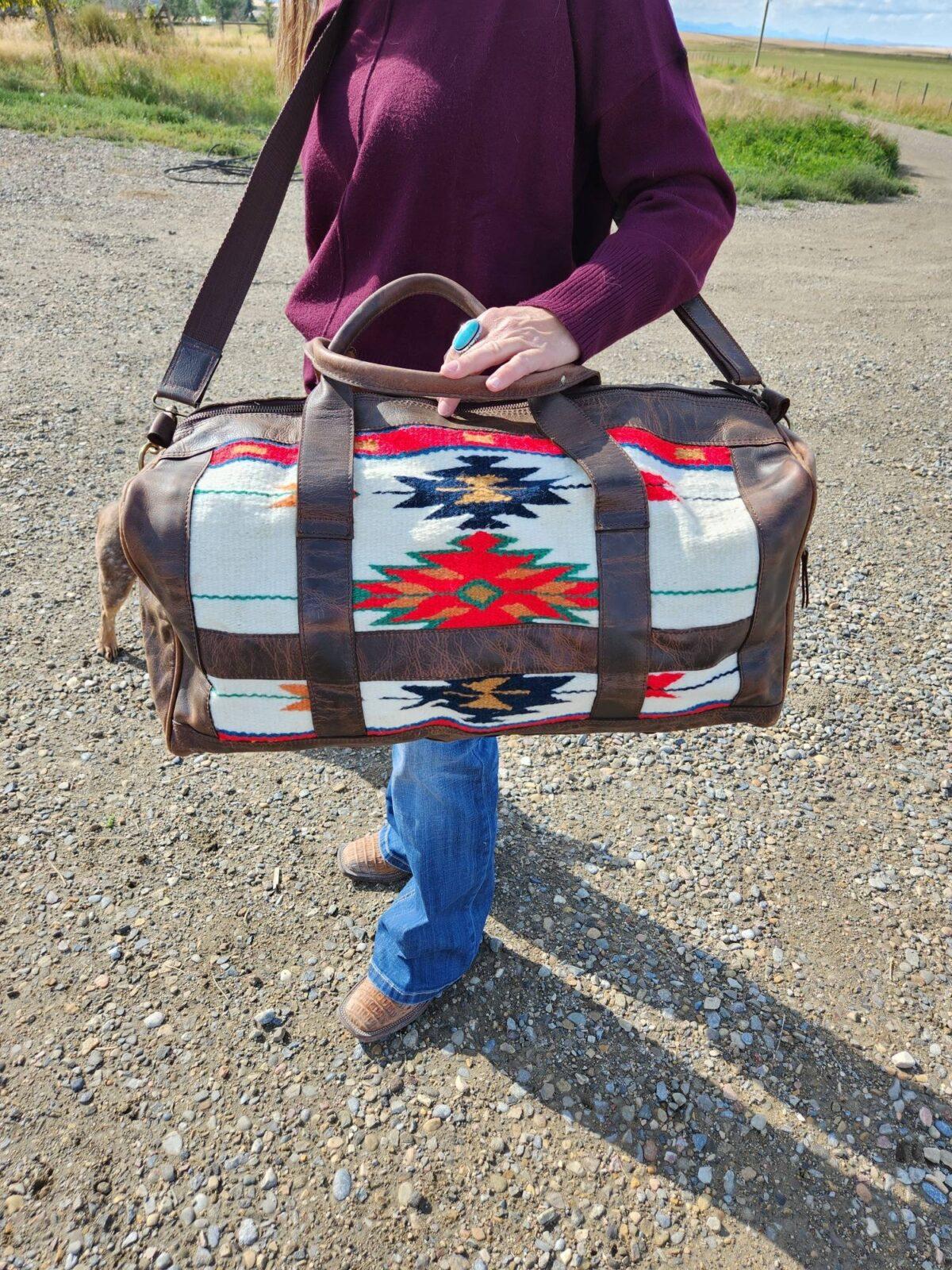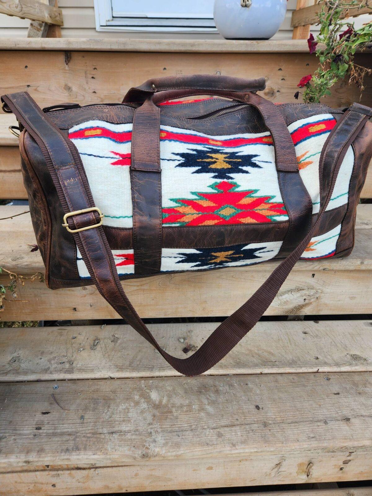 Elevate your travel game with our Alpine Saddle Blanket Duffel Bag, the perfect fusion of style, functionality, and durability. Whether you’re escaping to the mountains, exploring the city, or embarking on any adventure, this duffel bag is designed to meet your every need. The Alpine Saddle Blanket Duffel Bag boasts an exquisite pattern that combines vibrant shades of red, green, and blue on a classic off-white background. This handwoven saddle blanket pattern, enhanced by subtle distressed leather accents, not only captures attention but also exudes timeless elegance.