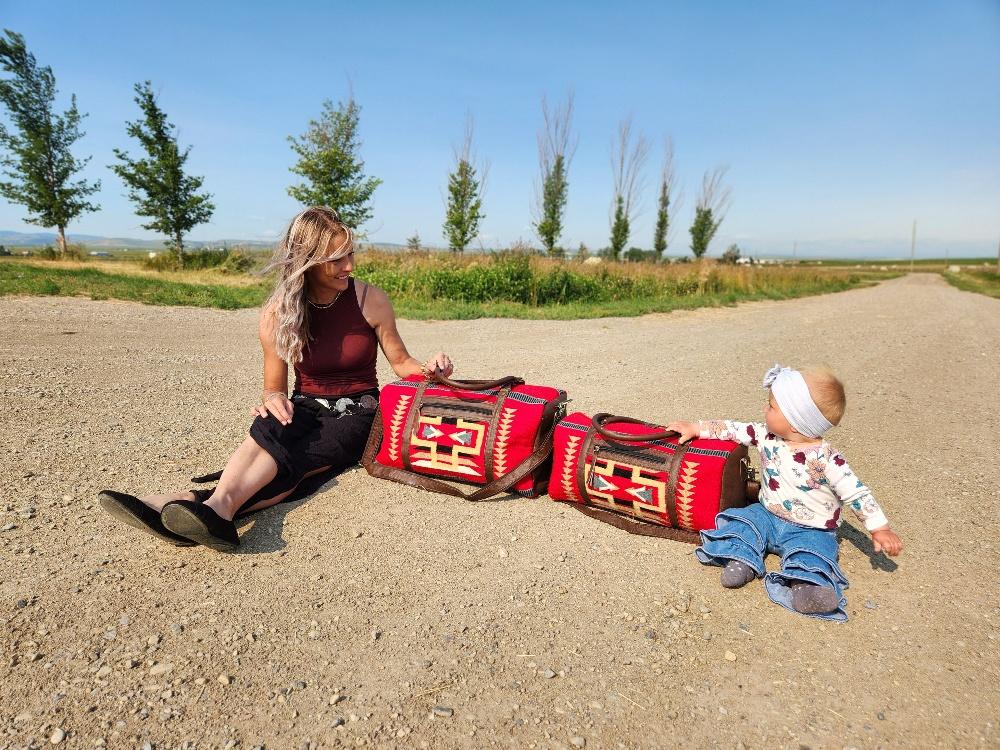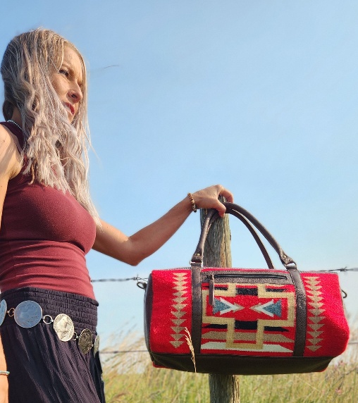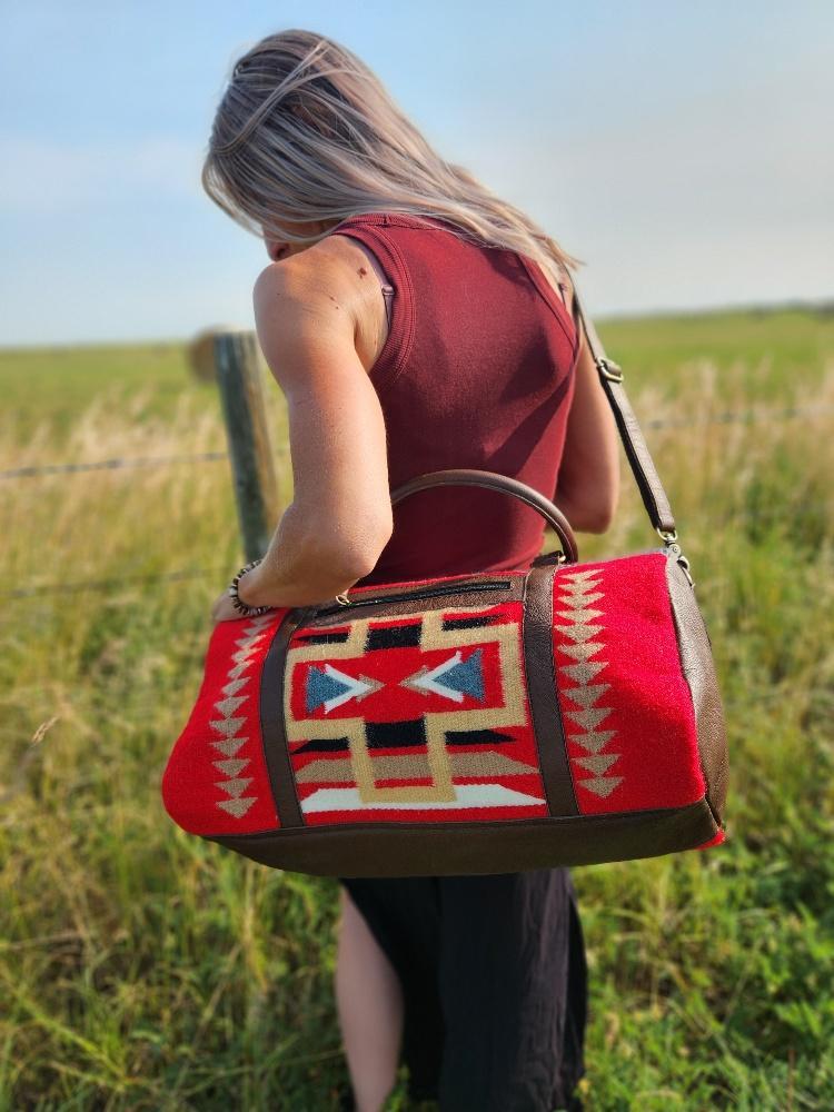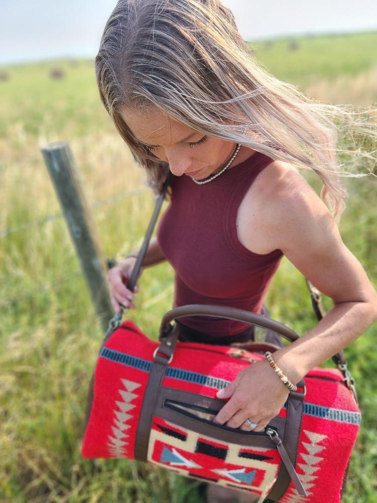 Inspired by the beauty of the Red Rocks of Santa Fe, New Mexico, Ranch Hand’s Sante Fe Leather Duffel Bags are the epitome of classic and rustic travel accessories. Handmade with durable woven wool, these western duffel bags feature unique and bold patterns, showcasing incredibly soft red wool with bold yet neutral accents. Their chic styling makes these travel bags ideal for both work and play.