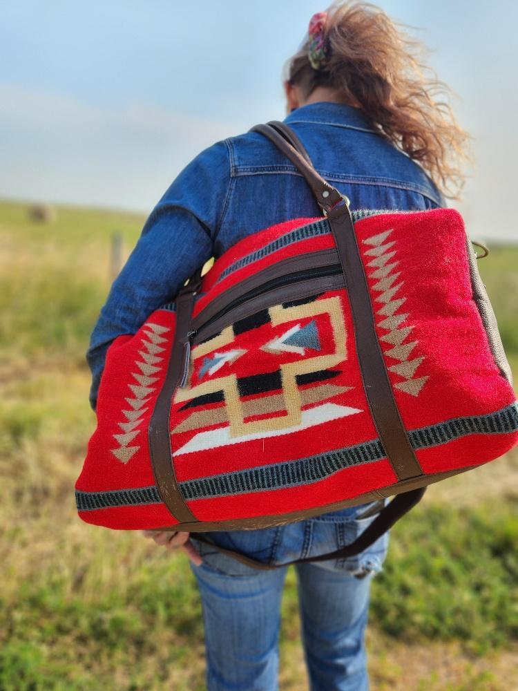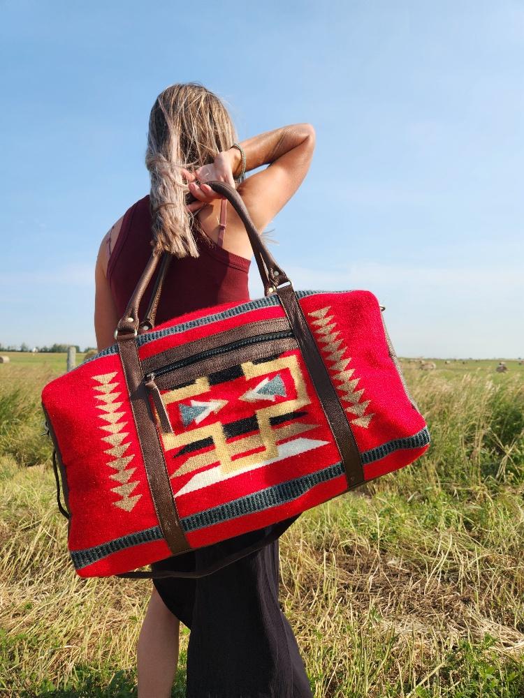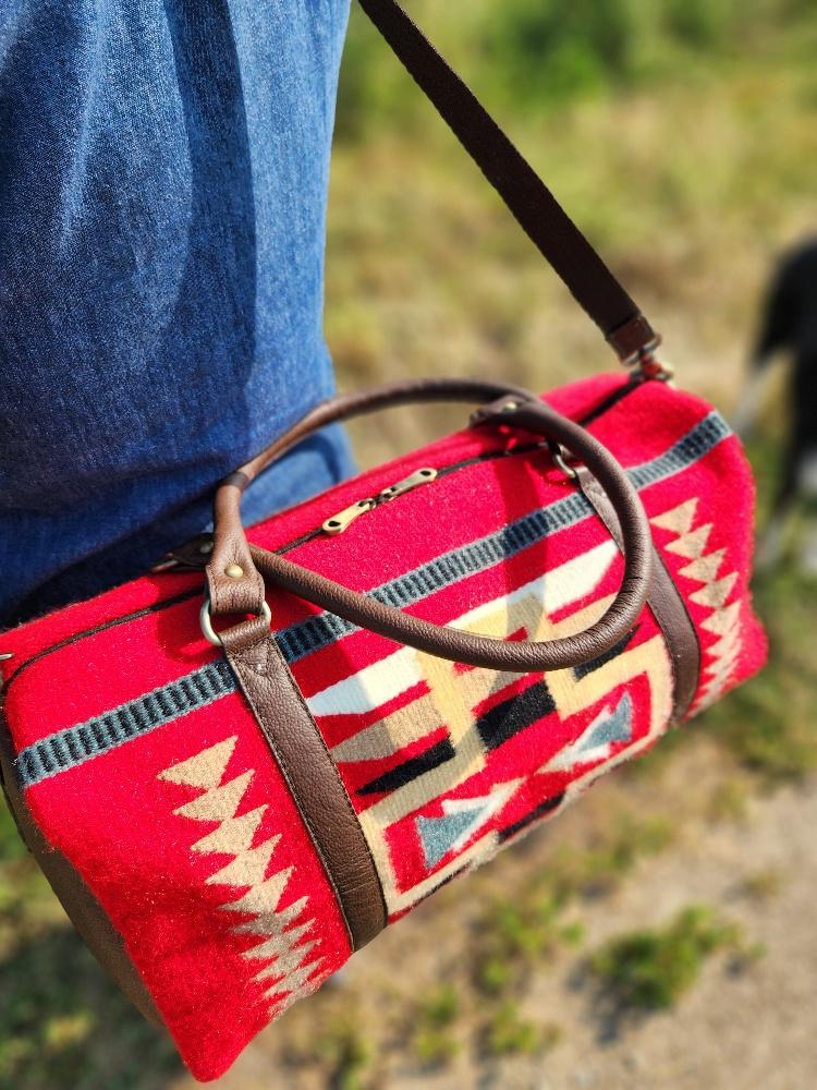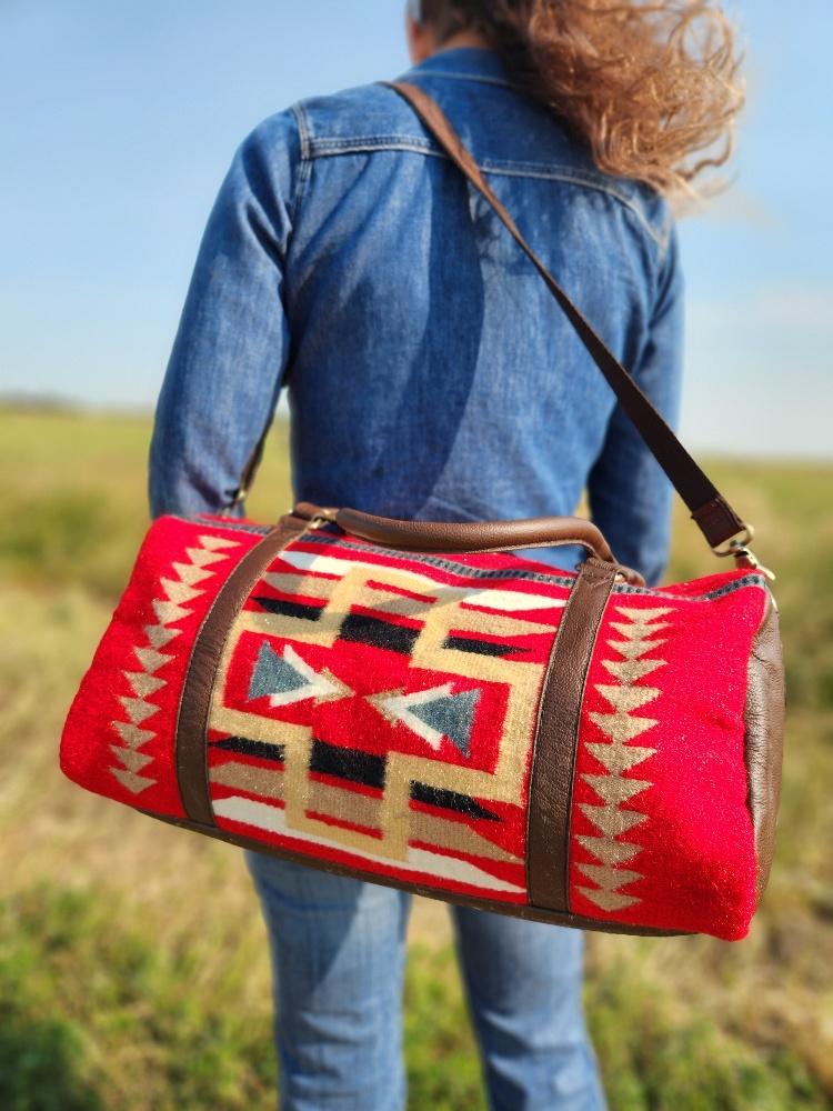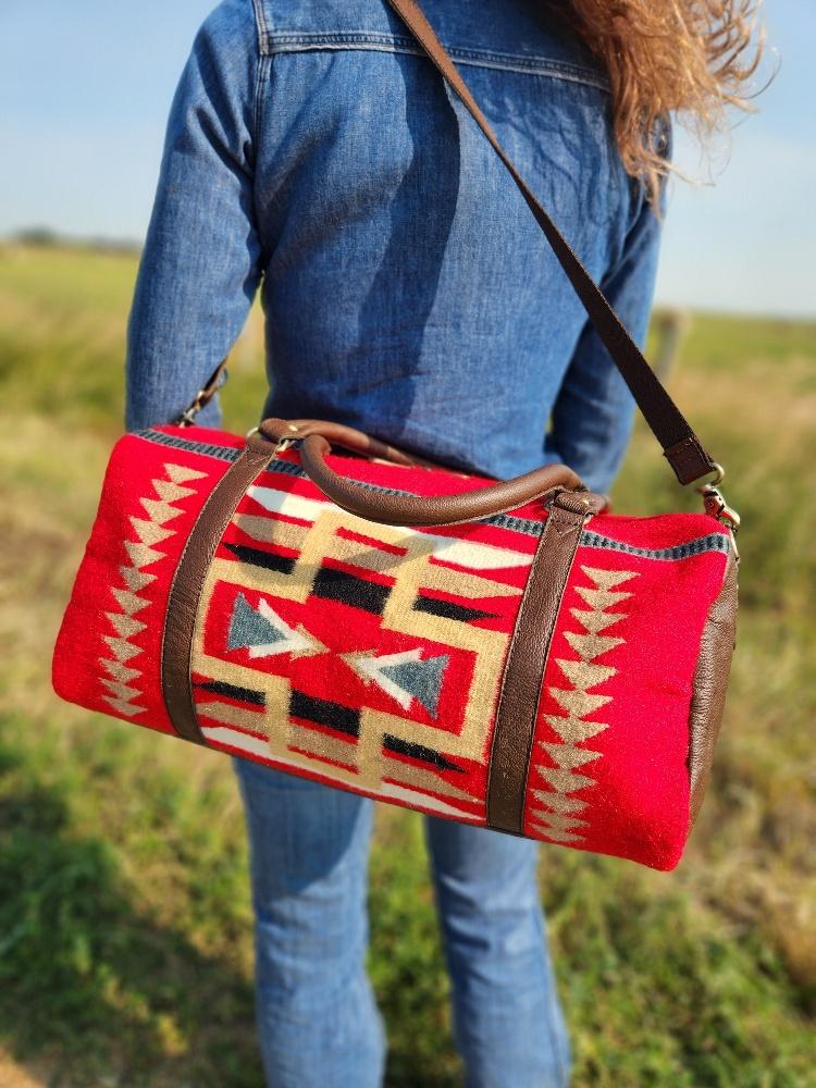 The Sante Fe Duffel Bag is the epitome of classic and rustic-inspired travel accessories. Handmade with durable woven wool, it features unique and bold patterns, showcasing incredibly soft red wool with bold yet neutral accents. Its chic styling makes this travel bag ideal for work or play.