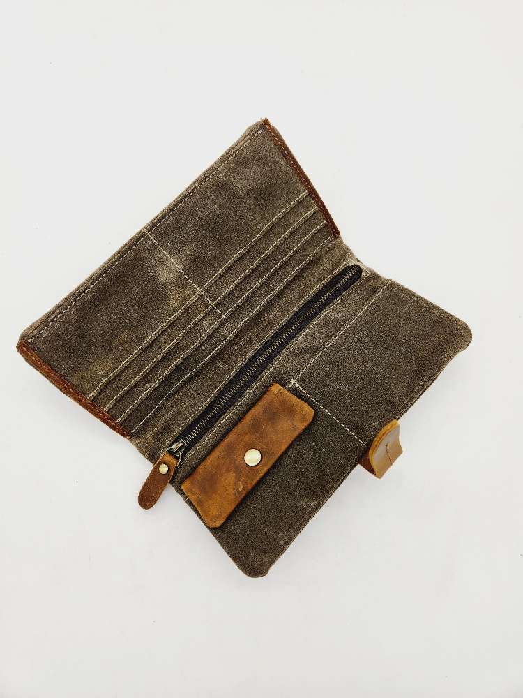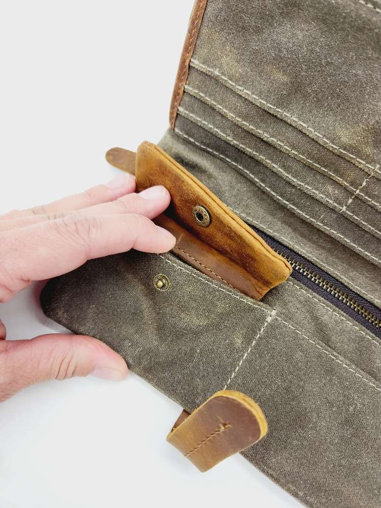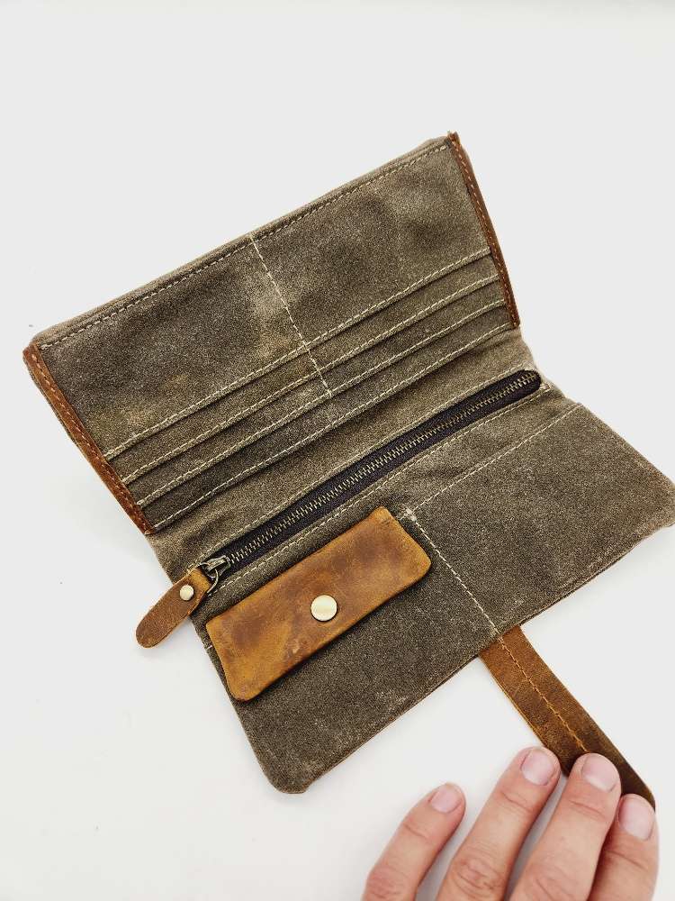 Whether you’re hiking through the wilderness, hitting the trails, or simply running errands around town, the Water-Resistant Canvas Clutch/Wallet with Crazy Horse Leather Details is ready for anything. Its blend of rugged durability and sleek design makes it the perfect accessory for those who lead an active and adventurous lifestyle.