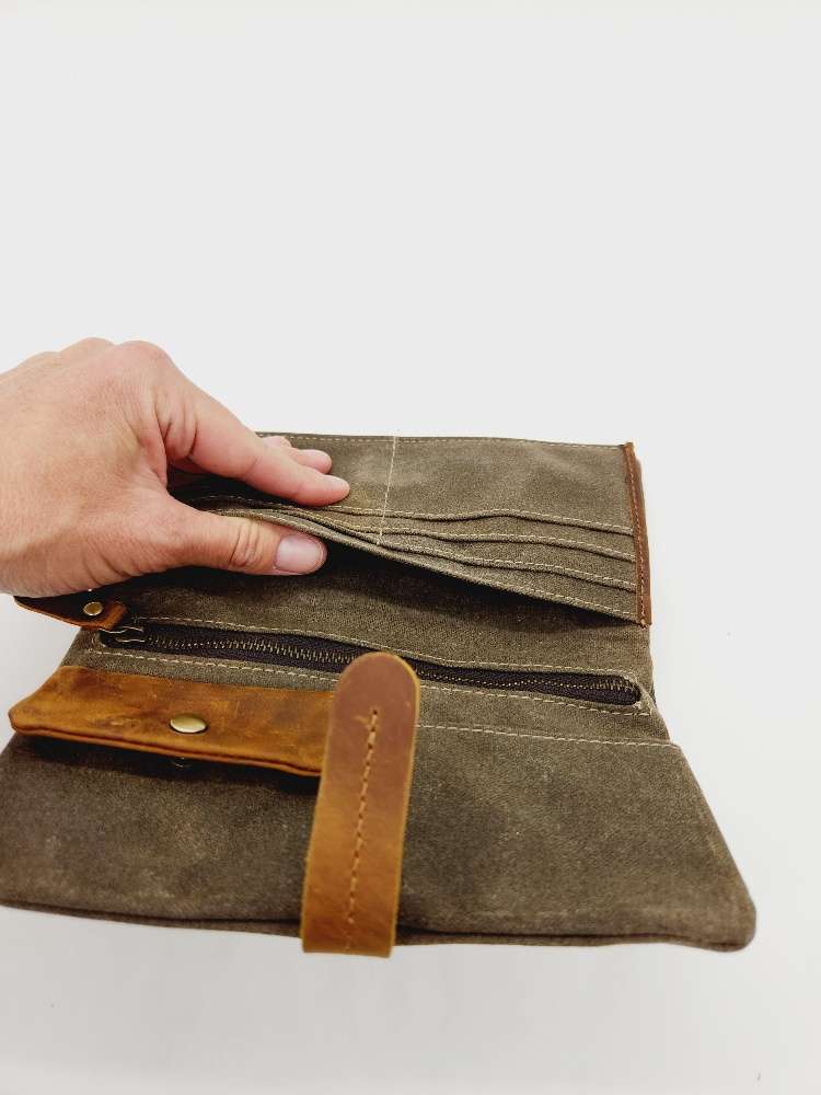 Check out the ultimate accessory for outdoor enthusiasts and everyday adventurers—the Water-Resistant Wax Canvas Clutch/Wallet with Crazy Horse Leather Details. Designed with durability and practicality in mind, this versatile clutch is your go-to companion for any journey, whether you’re exploring the great outdoors or navigating your daily routine.